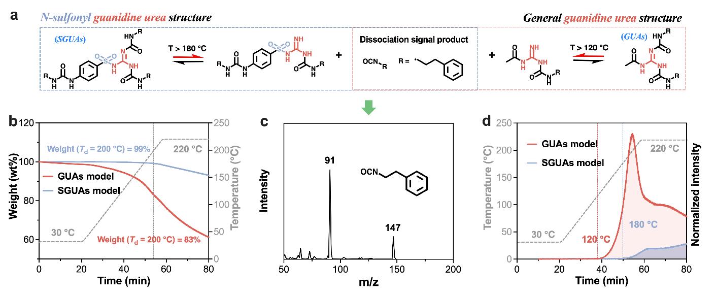 由于胍胺脲鍵具有高度的解離性,聚胍脲材料的熱穩(wěn)定性和尺寸穩(wěn)定性表現(xiàn)較差。針對(duì)這一問(wèn)題,近期報(bào)道了一種N-磺?;译褰Y(jié)構(gòu)(SGUA)。相比于GUA結(jié)構(gòu),SGUA結(jié)構(gòu)在保持動(dòng)態(tài)特性的同時(shí),其解離溫度得到了很大提升,從120 °C提升至180 °C(圖2)。相應(yīng)聚合物材料的熱穩(wěn)定性和尺寸穩(wěn)定性也得到了大幅提升。盡管SGUA結(jié)構(gòu)的解離溫度超過(guò)了180 °C,但這種材料在160 °C,20 MPa條件下仍能夠進(jìn)行熱壓成型。網(wǎng)絡(luò)的流變行為表明,這種網(wǎng)絡(luò)不再遵循解離型交換反應(yīng)機(jī)制,而是符合結(jié)合型網(wǎng)絡(luò)交換的特點(diǎn)。相關(guān)成果以“N-Sulfonyl Guanidine Urea to Design Ultrastrong,Stable,and Recyclable Associative Dynamic Polyurea Networks”為題,發(fā)表在Macromolecules(2024,57,23,10938–10947)。