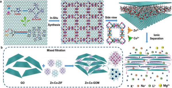 從鹽湖鹵水中獲取鋰資源是最重要的途徑之一。鹵水成分復雜,Mg2+和Li+水合離子半徑相似,鎂鋰分離難度大。膜分離技術具有節(jié)能、高效、環(huán)保、操作靈活和成本低等特點,可通過精細調(diào)控膜的孔徑和表面化學性質(zhì),實現(xiàn)對特定離子的選擇性分離。但膜的穩(wěn)定性、耐腐蝕性以及長期使用后的性能衰退仍然是制約膜分離技術應用的主要問題。針對上述問題,青海鹽湖所鹽湖有機質(zhì)與硼鉀分離技術課題組開發(fā)了一種新型的雙金屬有機框架(MOF)/氧化石墨烯(GO)復合膜,以提高鹽湖鋰的提取效率。