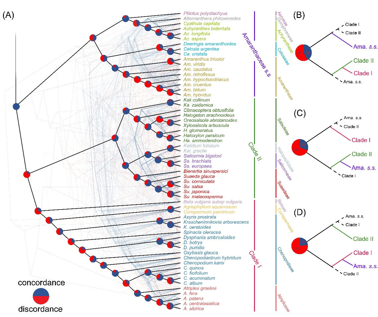 中國科學院西北高原生物研究所青藏高原植物適應與進化研究團隊綜合利用質體基因組和全長ITS序列,重建了廣義莧科的系統(tǒng)發(fā)育關系。通過質體基因組結構和序列比對分析,發(fā)現(xiàn)濱藜屬(Atriplex)和藜屬(Chenopodium)存在一段長約5200 bp的反向互補區(qū)域。適應性進化分析揭示了8個基因受到顯著的正選擇作用,這些基因可能在廣義莧科的進化中起到了驅動作用。系統(tǒng)發(fā)育結果表明,傳統(tǒng)藜科為單系類群,建議恢復其至科級分類學水平。對于廣義莧科的科級以下分類群,例如藜屬、鹽生草屬(Halogeton)以及豬毛菜亞族(Subtr. Salsolinae)為并系類群,建議通過建立更多的分類群或將藜族(Chenopodieae)和濱藜族(Atripliceae)合并來解決分類問題。核質沖突及不完全譜系分選是導致廣義莧科基因樹系統(tǒng)發(fā)育不一致的主要原因。本研究為廣義莧科的系統(tǒng)發(fā)育關系提供了新的見解,并指出后續(xù)仍需采取多種數(shù)據(jù)集完善廣義莧科的分類修訂。