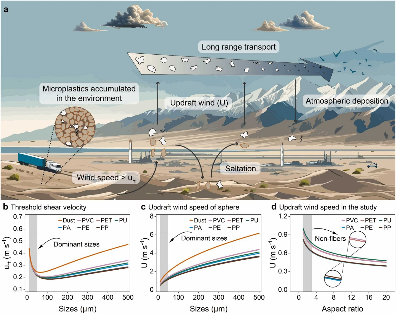 研究團(tuán)隊通過對祁連山地區(qū)的總懸浮顆粒物進(jìn)行系統(tǒng)采樣,探究了該地區(qū)的大氣微塑料污染,并使用拉格朗日粒子擴散模型探索了大氣微塑料的潛在源區(qū)。結(jié)果顯示,大氣微塑料數(shù)量濃度為4.07±2.37 個 m-3,在春季最高;大氣微塑料質(zhì)量濃度為0.126±0.152 μg m-3,在冬季最大。微塑料主要聚合物類型為PA、PE、PET、PP、PU和PVC,微塑料數(shù)量集中在小于50微米的尺寸,形狀以碎片為主。局地人類活動對大氣中微塑料濃度的影響有限,潛在源區(qū)的粉塵排放顯著影響大氣微塑料濃度。粉塵和微塑料的相似閾值剪切速度表明它們在潛在源區(qū)的沙塵事件期間共同排放。一旦微塑料被夾帶到氣流中,微塑料懸浮所需較低的上升風(fēng)速會促進(jìn)微塑料長距離大氣傳輸。