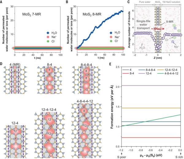 研究團隊結(jié)合分子動力學(xué)模擬和密度泛函理論計算,揭示了單層MoS?晶界處形成的八元環(huán)(8-MR)孔結(jié)構(gòu)的尺寸篩分效應(yīng),該孔徑能夠允許單鏈水分子快速通過,同時完全阻止水合離子(如Na?和Cl?)的通過。因此,單層MoS?晶界處形成的八元環(huán)(8-MR)孔結(jié)構(gòu)可以作為分子篩,有效分離水和離子。實驗過程中,研究團隊通過精確控制MoS?晶粒的生長方向(固定0°或60°的相對取向),成功在大面積單層MoS?膜中實現(xiàn)了豐富的8-MR孔結(jié)構(gòu)。通過進一步調(diào)節(jié)晶粒生長時間、硫蒸氣壓力等參數(shù),實現(xiàn)了對晶粒尺寸和晶界密度的精確調(diào)控。優(yōu)化后的MoS?膜在多種測試條件下展現(xiàn)出優(yōu)異的性能,如高水滲透性、高離子選擇性以及良好的機械和化學(xué)穩(wěn)定性。這使得其在海水淡化、污水處理等領(lǐng)域具有廣闊的應(yīng)用前景,為二維材料在分離膜領(lǐng)域的應(yīng)用提供了新的思路。該方法不僅能夠精確控制孔結(jié)構(gòu),還能實現(xiàn)大面積連續(xù)膜的制備,具有重要的實際應(yīng)用價值。