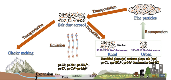 研究表明,鹽塵可能是內(nèi)陸地區(qū)Na?和Cl?離子的重要來源,尤其是在春季和冬季,西北風(fēng)將大量鹽塵輸送到下游地區(qū),甚至影響到東亞和更廣泛區(qū)域的空氣質(zhì)量。此外,鹽塵的排放可能形成一個區(qū)域正反饋循環(huán):鹽塵加劇了冰川的消融,冰川融化則增加了河流徑流量,進(jìn)而擴(kuò)大了鹽湖及周邊鹽漬土的范圍,從而導(dǎo)致更多的鹽塵釋放到大氣中并進(jìn)一步加速冰川融化。這一認(rèn)識對全球生態(tài)安全和水資源管理具有重要啟示意義。這項(xiàng)研究系統(tǒng)評估了鹽塵排放對大氣顆粒物沉積的貢獻(xiàn),揭示了鹽塵在區(qū)域及全球氣候環(huán)境變化中的潛在作用。根據(jù)本研究結(jié)果,建議在全球變暖背景下,未來制訂環(huán)境政策和構(gòu)建氣候模型時需要更多地關(guān)注內(nèi)陸鹽湖粉塵的影響。