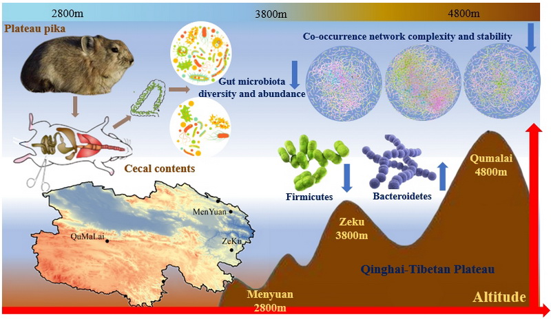 中國科學院西北高原生物研究所動物生態(tài)與資源保護研究團隊以青藏高原為研究區(qū)域,系統(tǒng)探討了高原鼠兔(Ochotona curzoniae)在不同海拔梯度下的腸道菌群結(jié)構(gòu)及功能變化。通過16S rRNA基因測序及短鏈脂肪酸(SCFA)含量分析,評估了不同海拔環(huán)境下腸道菌群的組成、功能及代謝特征。研究結(jié)果表明,隨著海拔升高,腸道菌群的α多樣性顯著下降,微生物群共現(xiàn)網(wǎng)絡的復雜性亦呈減少趨勢。然而,SCFA的含量在不同海拔間未表現(xiàn)出顯著差異,表明高原鼠兔對SCFA的產(chǎn)生和需求可能已趨于穩(wěn)定。此外,微生物群落結(jié)構(gòu)隨海拔變化呈現(xiàn)適應性調(diào)整的趨勢,具體表現(xiàn)為擬桿菌門相對豐度的顯著上升,而厚壁菌門的比例則顯著下降。進一步分析微生物群落的組裝機制發(fā)現(xiàn),隨海拔升高,群落組裝過程逐漸趨于確定性,表明環(huán)境篩選在高海拔條件下對微生物群落的塑造作用增強。KEGG通路分析揭示,高原鼠兔腸道菌群在代謝、遺傳信息處理及有機體系統(tǒng)相關(guān)通路上呈現(xiàn)顯著上調(diào)趨勢。高原鼠兔腸道菌群可能通過調(diào)控代謝途徑及富集適應高原環(huán)境的微生物種群,以幫助宿主應對極端的高海拔生態(tài)壓力。本研究強調(diào)了腸道菌群在動物適應極端環(huán)境中的關(guān)鍵作用,揭示了海拔對腸道菌群組成與功能的影響,為理解動物如何通過微生物機制適應高海拔環(huán)境提供了科學依據(jù)。研究成果不僅對高原鼠兔的生態(tài)適應研究具有重要意義,也為其他極端環(huán)境物種的研究提供了參考。