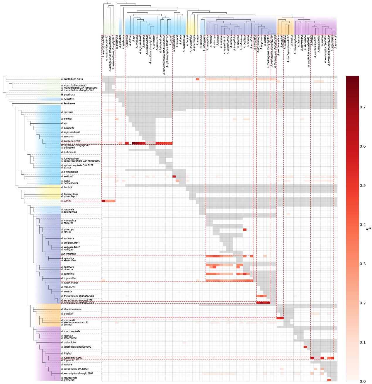 中國科學(xué)院西北高原生物研究所青藏高原植物適應(yīng)與進(jìn)化研究團(tuán)隊選擇東亞蒿屬及其近緣類群共94個物種進(jìn)行Illumina二代測序,利用質(zhì)體基因組、SNP數(shù)據(jù)和nrDNA重建了該類群的系統(tǒng)發(fā)育關(guān)系,并推測其生物歷史地理。研究結(jié)果表明,質(zhì)體捕獲、雜交、漸滲等事件導(dǎo)致了蒿屬及其屬下亞屬的強(qiáng)烈核質(zhì)沖突,現(xiàn)有的蒿屬下分類方法無法將大多數(shù)亞屬劃分為單系。東亞蒿屬為漸新世早期就地起源,氣候震蕩和高原隆升促進(jìn)了該類群的多樣化發(fā)展。黑蒿(A. palustris)、櫛葉蒿(A. pectinata)、庵閭(A. keiskeana)和臭蒿(A. hedinii)可能是東亞區(qū)域現(xiàn)代蒿屬下主要譜系的早期分化類群。本研究揭示了東亞蒿屬及其亞屬復(fù)雜的系統(tǒng)發(fā)育關(guān)系和進(jìn)化歷史,為蒿屬植物的演化提供了新的見解。