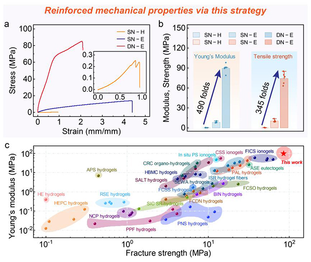 超強(qiáng)凝膠通常模量和強(qiáng)度較高,但力學(xué)韌性一直是挑戰(zhàn)。該研究通過將低共熔溶劑(DES)引入半結(jié)晶性PVA水凝膠中進(jìn)行機(jī)械訓(xùn)練,實(shí)現(xiàn)了超高強(qiáng)度與優(yōu)異韌性的兼容(圖1)。在溶劑置換過程中,通過氫鍵重構(gòu)促進(jìn)PVA結(jié)晶增強(qiáng),形成密集的納米晶域并賦予超滯后效應(yīng),實(shí)現(xiàn)單次預(yù)伸展的“超滯后介導(dǎo)的機(jī)械訓(xùn)練”。同時(shí),得益于超滯后的結(jié)構(gòu)阻滯效應(yīng),機(jī)械訓(xùn)練后的單網(wǎng)絡(luò)凝膠還可進(jìn)一步浸泡前驅(qū)液,并通過自由基聚合構(gòu)建化學(xué)交聯(lián)的第二網(wǎng)絡(luò)形成層級(jí)互穿。此層級(jí)互穿的雙網(wǎng)絡(luò)結(jié)構(gòu)賦予凝膠材料微觀協(xié)同介觀的多尺度能量耗散特性,極大地提升了力學(xué)性能,其斷裂強(qiáng)度達(dá)~ 85.2 MPa、楊氏模量為~ 98 MPa、斷裂韌性提升至~ 130.6 MJ·m?3,遠(yuǎn)優(yōu)于目前報(bào)道的強(qiáng)韌聚合物凝膠體系(圖2)。