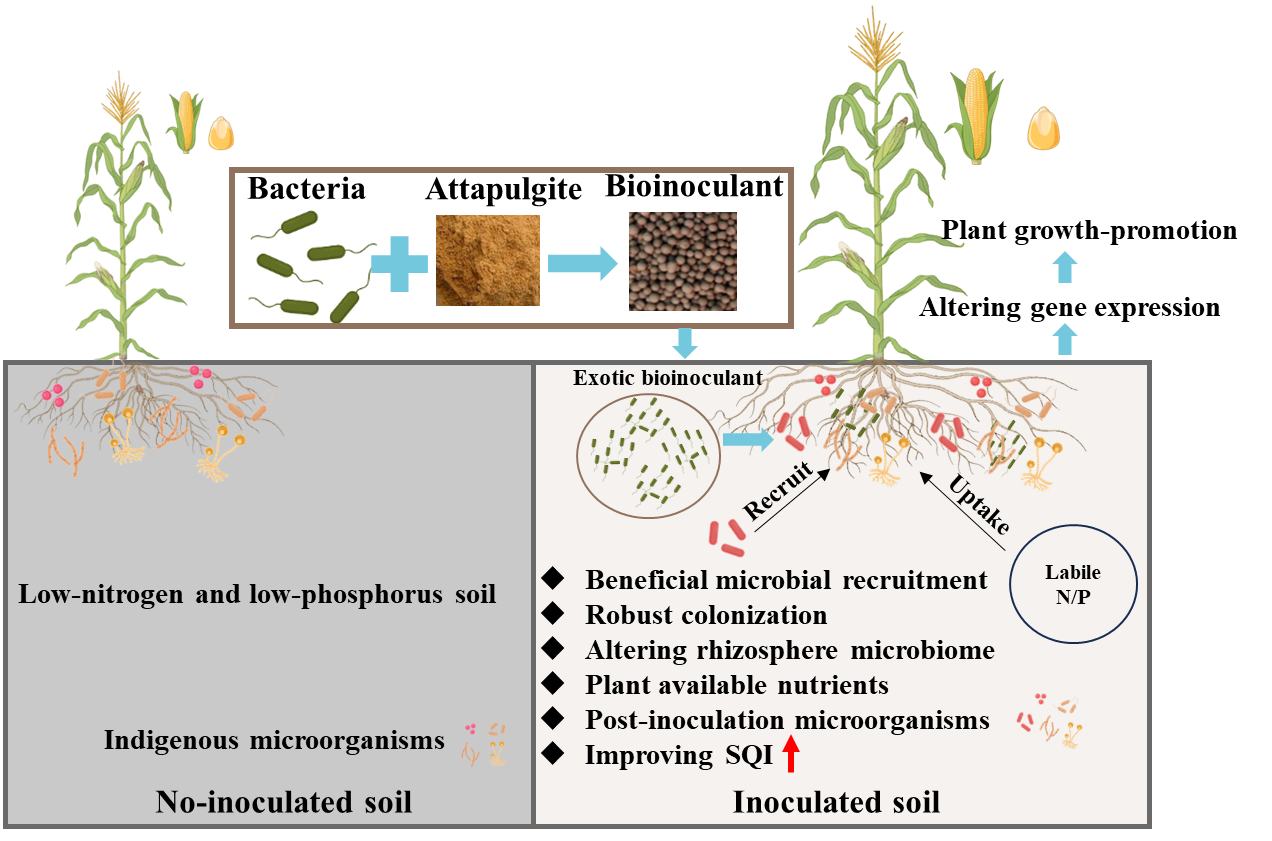 中國科學(xué)院西北生態(tài)環(huán)境資源研究院王若愚研究員團(tuán)隊與奧地利國家技術(shù)研究院的Angela Sessitsch教授和Günter Brader教授合作,系統(tǒng)揭示了固體顆粒微生物菌劑(貝萊斯芽孢桿菌Bacillus velezensis FZB42與粘土材料組成)通過調(diào)控根際微生物群落和玉米基因應(yīng)答,改善貧瘠堿性黃土質(zhì)量并促進(jìn)玉米生長的機(jī)制。研究設(shè)置了減施氮肥與不施磷肥的處理條件,探索了微生物菌劑在低外源肥料施用下,如何提高作物對土壤養(yǎng)分的吸收,進(jìn)而促進(jìn)增產(chǎn)的效果。