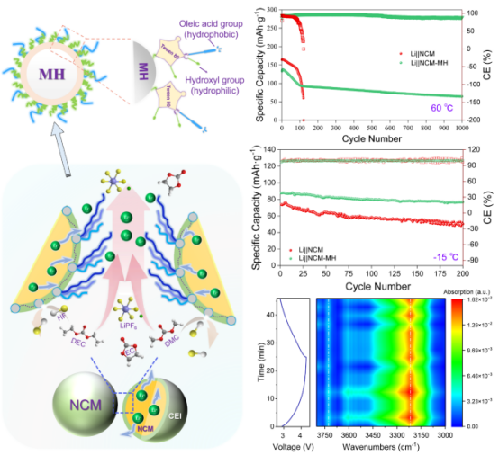 研究團(tuán)隊首先以Tween80為框架物質(zhì)構(gòu)建一種弱交聯(lián)柔性受限空間,電沉積獲得所需超細(xì)納米氫氧化鎂載體(D50=15 nm),并通過Tween80原位改性實現(xiàn)納米氫氧化鎂功能化。用所得材料對鋰電池三元正極材料(LiNi0.5Co0.2Mn0.3O2)進(jìn)行表面修飾,并進(jìn)行電池組裝和性能測試。原位紅外分析表明,Li?與 Tween80 分子間存在持續(xù)的配位和解離過程,使Tween80 分子荷電狀態(tài)發(fā)生動態(tài)變化,并在電場作用下發(fā)生連續(xù)的構(gòu)型轉(zhuǎn)變,亦即“烷基鏈搖曳”行為。烷基鏈搖曳使得納米氫氧化鎂在電池循環(huán)伊始就參與反應(yīng),快速形成薄而致密的富鎂無機(jī)正極固態(tài)電解質(zhì)界面膜。這種膜熱穩(wěn)定性高、耐腐蝕性強(qiáng),能夠有效抵御高溫電解液攻擊。而在低溫環(huán)境下,電解液通常會在正極表面積聚,并常因流動性差而阻礙鋰離子傳輸。此時烷基鏈搖曳可顯著促進(jìn)電解液的界面流動,兼之富鎂界面層具有優(yōu)異離子導(dǎo)電性,使鋰離子低溫傳輸變得非常順暢。研究結(jié)果表明,通過“烷基鏈搖曳”界面驅(qū)動設(shè)計,鋰離子電池可在60℃穩(wěn)定充放電1000圈以上,同時保持70 mAh/g容量和90%以上庫侖效率。在-5℃和-15℃分別循環(huán)500圈、200圈后,容量仍能保持在80 mAh/g以上。該研究在配備熱管控系統(tǒng)后,電池實際寬溫域性能有望進(jìn)一步提升。