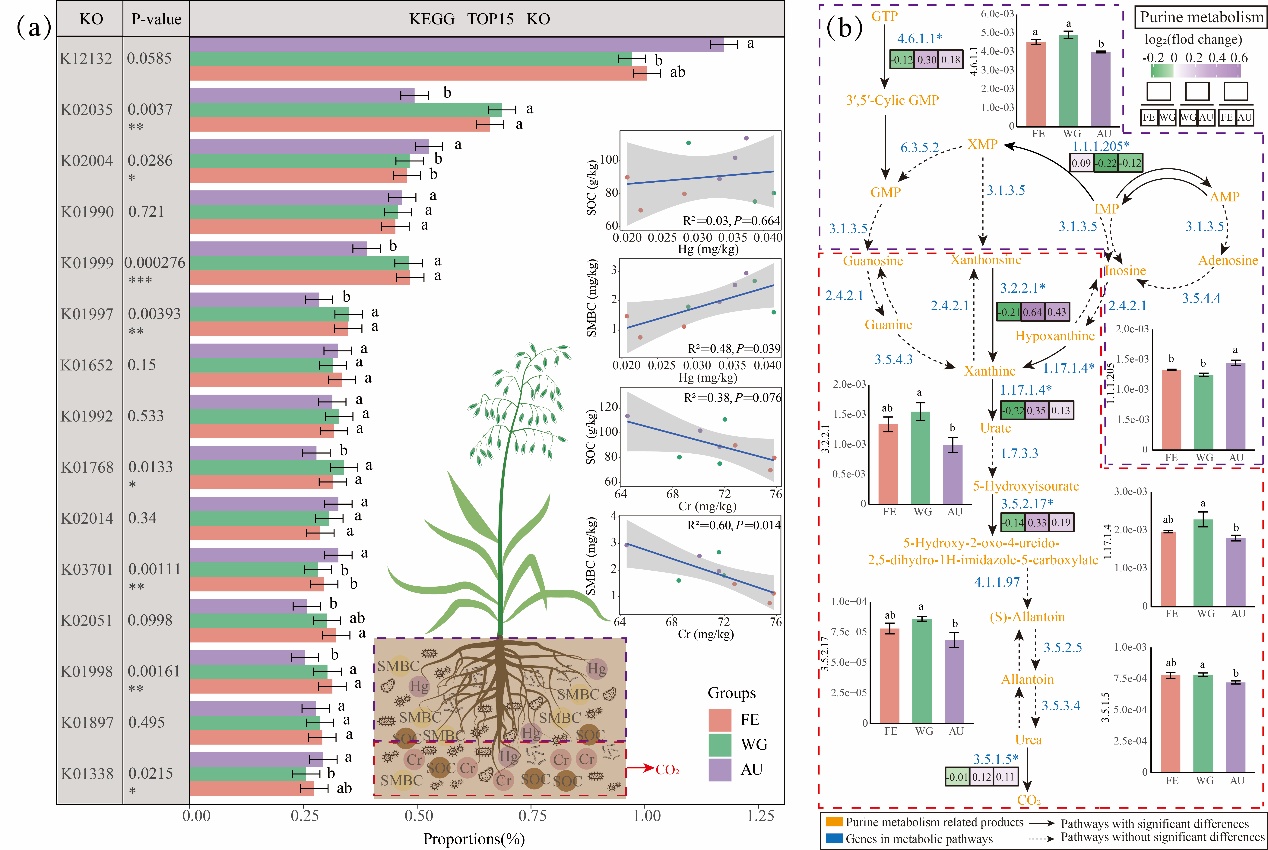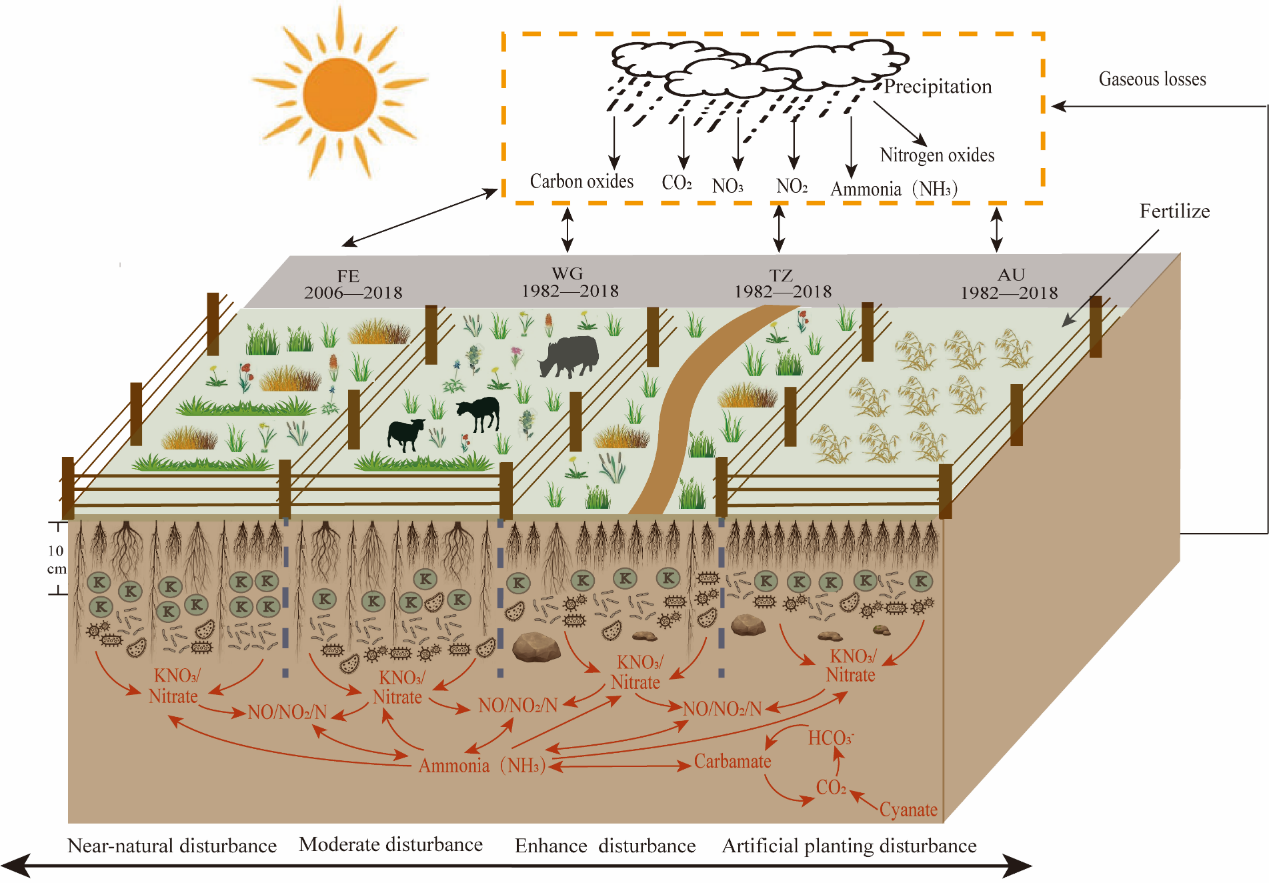 針對這一問題,中國科學(xué)院西北高原生物研究所三江源草原生態(tài)系統(tǒng)國家觀測研究站團(tuán)隊(duì)在青藏高原祁連山南麓選擇了圍封(FE)、冬季放牧(WG)和開墾(AU)3種不同干擾的草地管理措施為研究對象,探明了微生物群落結(jié)構(gòu)和功能如何響應(yīng)因草地管理引起的植被群落和PTEs的變化,以及對它們的調(diào)控路徑。研究結(jié)果表明,草地管理措施改變了地上禾本科和豆科植被群落的結(jié)構(gòu)及地下生物量的分配,導(dǎo)致K的分布變化,進(jìn)而引起真菌群落結(jié)構(gòu)和氮代謝酶的顯著變化。Cr和Hg與微生物相互作用影響SOC和SMBC的代謝過程,可能對高寒草甸固碳具有一定積極作用,并且高寒草甸對PTEs具有良好的抗性。適度干擾的冬季放牧(WG)有利于維持高寒草地微生物群落結(jié)構(gòu)和功能的穩(wěn)定性。本研究為青藏高原祁連山高寒草甸的改善提供科學(xué)依據(jù)。