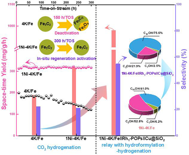 中國科學(xué)院蘭州化學(xué)物理研究所低碳催化與二氧化碳利用全國重點(diǎn)實(shí)驗(yàn)室可再生碳資源催化轉(zhuǎn)化組在前期Ni催化CO2加氫合成C2+OH(Angew. Chem. Int. Ed.,2023,DOI: https://doi.org/10.1002/anie.202311335.)和多相催化烯烴氫甲?;铣扇?/span>J. Catal. 2025,DOI: 10.1016/j.jcat.2025.116095;J. Org. Chem,2023,DOI:?10.1021/acs.joc.2c02105等)的研究基礎(chǔ)上,研究人員一方面構(gòu)建了Ni-K共修飾的Fe基催化劑(1Ni-4K/Fe),將CO2加氫生成C2+OH的時空收率(STY)提高到317.0 mg/g/h,并且能在300h內(nèi)穩(wěn)定運(yùn)行;另一方面利用接力催化思想,構(gòu)建了“CO2加氫-烯烴氫甲?;?醛氫化”(1Ni-4K/Fe||Rh1/POPs||Cu@SiO2)的三串聯(lián)體系,將產(chǎn)物中烯烴進(jìn)一步轉(zhuǎn)化為醇,實(shí)現(xiàn)C2+OH的時空收率達(dá)到980.5 mg/g/h,選擇性可達(dá)55.0%,而且由于氫甲酰化的增碳作用,C2+OH中C3+OH的占比可達(dá)75.6%,顯著提升碳的利用率。