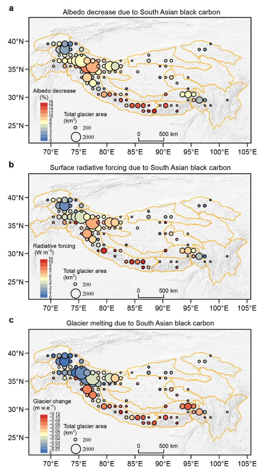 近日,中國(guó)科學(xué)院西北生態(tài)環(huán)境資源研究院康世昌研究員課題組,聯(lián)合清華大學(xué)陳德亮教授、美國(guó)猶他州立大學(xué)猶他州氣候中心Robert教授,發(fā)現(xiàn)南亞黑碳?xì)馊苣z通過(guò)增加消融和減少冰川物質(zhì)補(bǔ)給,加速了以冰川退縮為主的青藏高原固體水儲(chǔ)量損失,尤其在喜馬拉雅地區(qū)及其孕育的印度河、恒河-布拉馬普特拉河流域最為顯著。