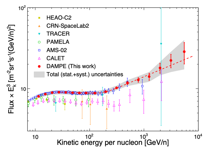 近期,暗物質(zhì)粒子探測衛(wèi)星(DAMPE)“悟空”號國際合作組在高能宇宙線能譜測量方面取得重要進(jìn)展,獲得了宇宙射線硼元素在10 GeV/n–8 TeV/n的微分通量譜,首次發(fā)現(xiàn)了182 GeV/n附近能譜“硬化”的現(xiàn)象。研究成果發(fā)表于《物理評論快報(bào)》(Physical Review Letters)。