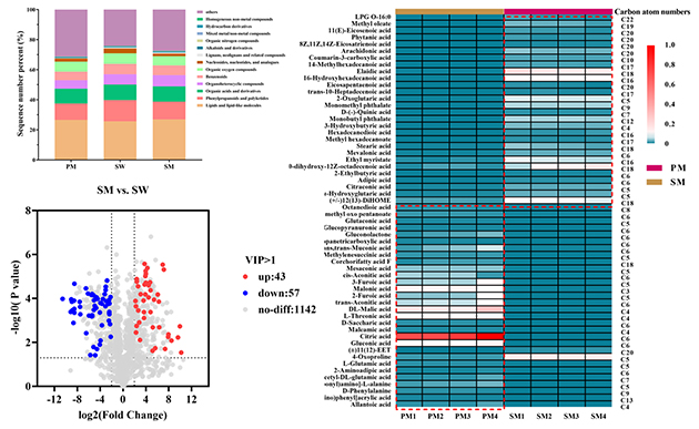 非靶向代謝組學(xué)分析共鑒定出1242種代謝物。在扁蓿豆植株甲醇提取物中,短鏈有機(jī)酸及其衍生物的相對(duì)豐度較高;根際土壤水提物中富含生物堿和黃酮類化合物;而根際土壤甲醇提取物則以長(zhǎng)鏈有機(jī)酸及其衍生物為主。進(jìn)一步發(fā)現(xiàn),短鏈有機(jī)酸、其衍生物以及黃酮類化合物可能為與扁蓿豆化感作用相關(guān)的關(guān)鍵候選化感物質(zhì)。