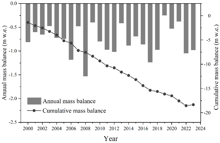 中國(guó)科學(xué)院西北生態(tài)環(huán)境資源研究院阿爾泰山冰凍圈科學(xué)與可持續(xù)發(fā)展綜合觀測(cè)研究站(簡(jiǎn)稱阿爾泰山站)研究團(tuán)隊(duì)高精度重建了薩吾爾山木斯島冰川2000年至2023年物質(zhì)平衡變化過程,為深入理解冰川變化對(duì)氣候變化響應(yīng)的區(qū)域特征和預(yù)估未來冰川變化及其影響提供了重要數(shù)據(jù)支撐和研究思路。