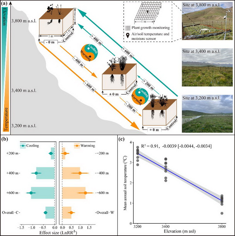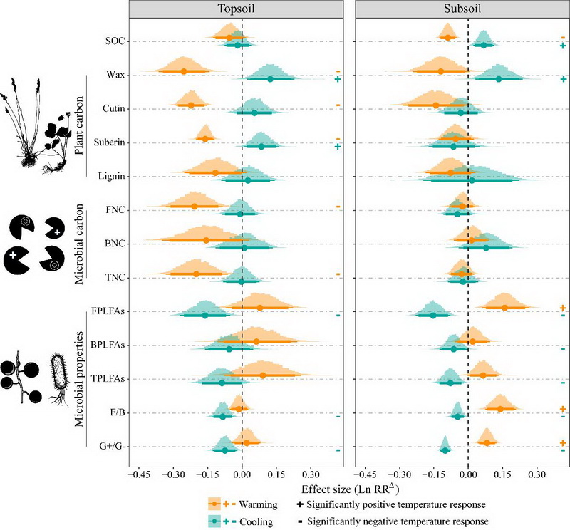 中國科學院西北高原生物研究所高寒生態(tài)系統(tǒng)與全球變化研究團隊依托2007年在青海海北高寒草地生態(tài)系統(tǒng)國家野外科學觀測研究站建立的“山體垂直帶雙向移栽實驗”平臺,基于生物標志物技術(shù),并借助貝葉斯Meta統(tǒng)計分析在估計研究間異質(zhì)性和合并效應量方面的優(yōu)勢(尤其在納入研究數(shù)量較少時)、獨特的后驗分布估計、靈活的參數(shù)設(shè)置和便利的結(jié)果圖形化展示方法等特點,創(chuàng)新性地采用貝葉斯Meta分析方法分析控制實驗數(shù)據(jù),對多組處理、對照實驗進行了歸納性總結(jié),進而系統(tǒng)評估量化了增溫、降溫16年后高寒草甸表層(0-10 cm)和亞表層土壤(20-30 cm)有機碳含量的影響因素(包括植物生物量和多樣性、土壤理化性質(zhì)、植物源碳組分,微生物源碳組分以及微生物群落特性等)的變化及其與有機碳含量的關(guān)系。