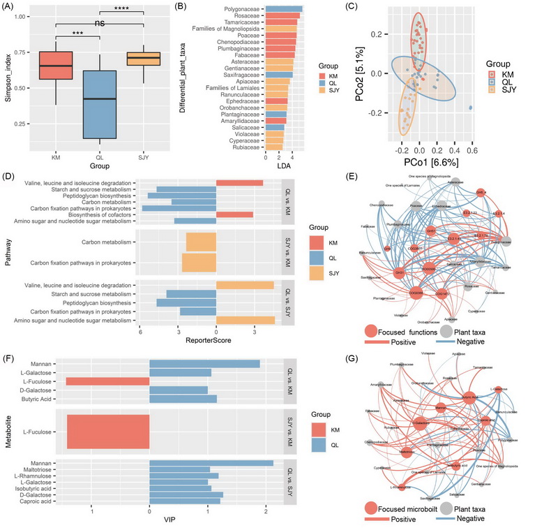中國科學院西北高原生物研究所動物生態(tài)與資源保護研究團隊在青藏高原青海湖流域、昆侖山及三江源三大典型區(qū)域采集了巖羊的新鮮糞便樣本,利用trnL植物DNA條形碼技術、宏基因組測序技術和非靶向代謝組學技術,構建了巖羊食性 - 微生物 - 代謝物多組學關聯(lián)分析框架,深入解析了巖羊在青藏高原不同區(qū)域的食性差異、腸道微生物組成與功能特征及其代謝產物差異,探索了食性結構與微生物共生系統(tǒng)的協(xié)同變異規(guī)律,揭示了宿主 - 微生物共生系統(tǒng)在區(qū)域適應中的協(xié)同進化模式。