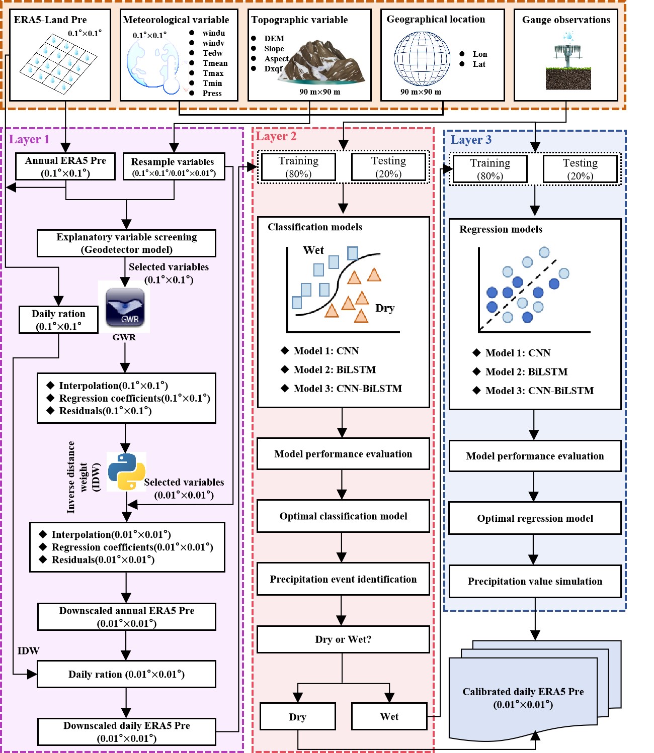 TLIDC技術(shù)框架。TLIDC框架整體分為三部分:降水?dāng)?shù)據(jù)的空間降尺度(表示為Layer 1)、降水事件的識別(表示為Layer 2)和降水量的模擬(表示為Layer 3)。Layer 1通過GWR模型,提供高空間分辨率的降水?dāng)?shù)據(jù),Layer 2和Layer 3利用構(gòu)建的CNN-BiLSTM模型來提高降尺度后降水?dāng)?shù)據(jù)的準(zhǔn)確性
