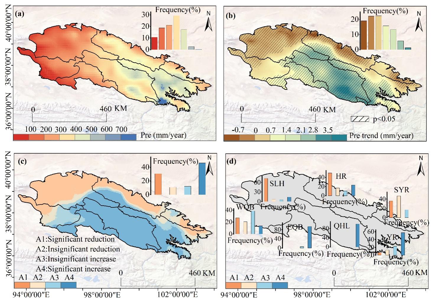 1950-2024年祁連山降水重建結(jié)果及時空變化特征。(a)重建降水的空間分布;(b) Sen’s趨勢估計(jì)與Mann-Kendall顯著性檢驗(yàn)結(jié)果;(c)祁連山降水時空變化的趨勢類型;(d)各子流域降水時空變化的趨勢類型。