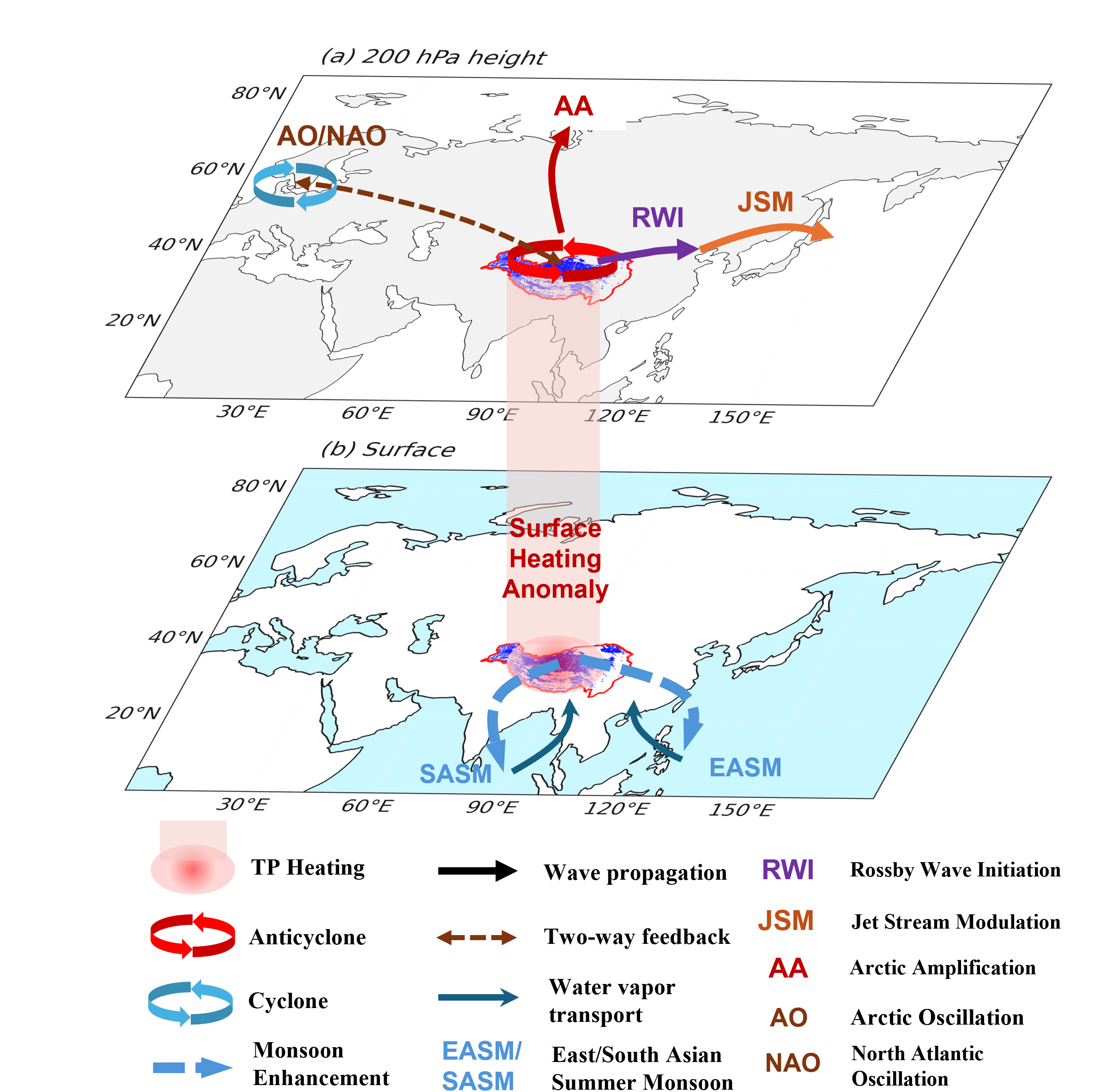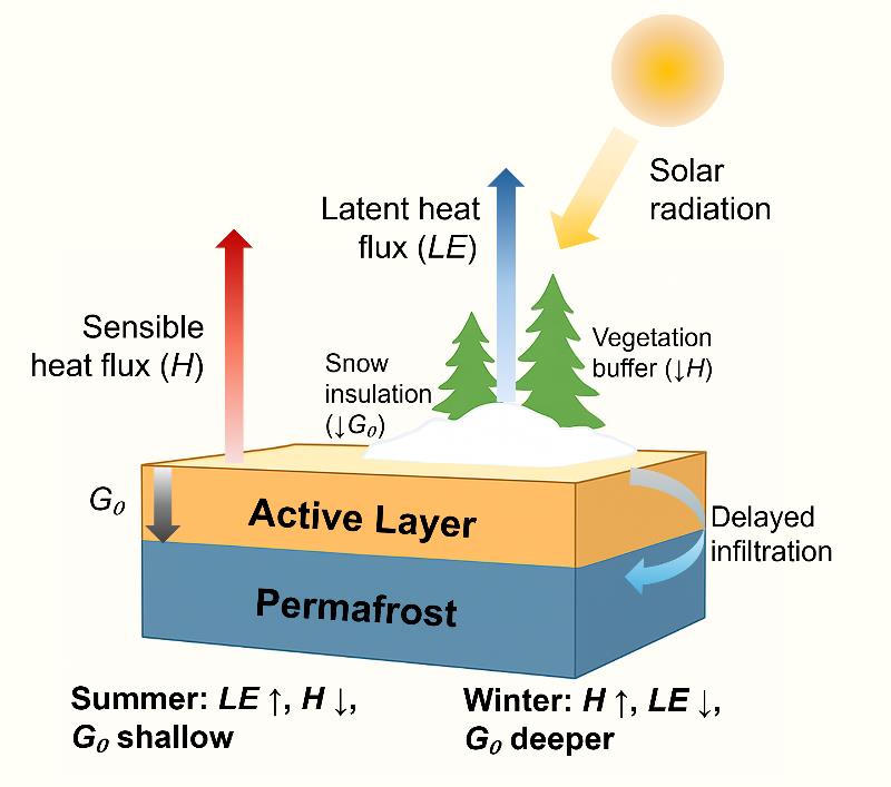 研究團(tuán)隊(duì)依托長(zhǎng)期野外觀測(cè)、遙感反演和過程模擬,完整描繪了“地表能量分配→邊界層演變→季風(fēng)與行星波響應(yīng)”的多尺度反饋鏈條。結(jié)果表明,多年凍土的“凍融記憶”,即凍結(jié)或融化狀態(tài)在季節(jié)間延續(xù)并影響后續(xù)熱量與水分過程,并對(duì)土壤熱物理特性及潛熱/顯熱分配造成影響,共同決定了能量釋放的節(jié)奏與路徑,進(jìn)而影響邊界層穩(wěn)定性、對(duì)流觸發(fā)和大氣遙相關(guān)結(jié)構(gòu)。