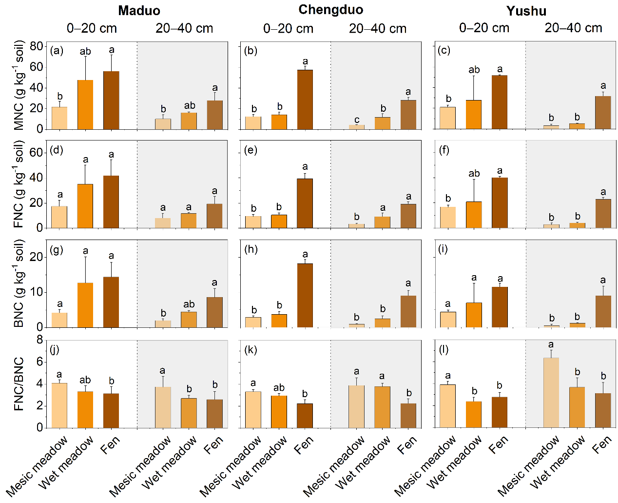 中國科學(xué)院西北生態(tài)環(huán)境資源研究院李玉強(qiáng)研究員團(tuán)隊,在青藏高原沿高寒草甸-濕地連續(xù)體設(shè)置了27個采樣點,通過測定氨基糖等指標(biāo),系統(tǒng)揭示了水文變化對土壤微生物殘體碳和顆粒有機(jī)碳積累及其對土壤有機(jī)碳貢獻(xiàn)的影響。