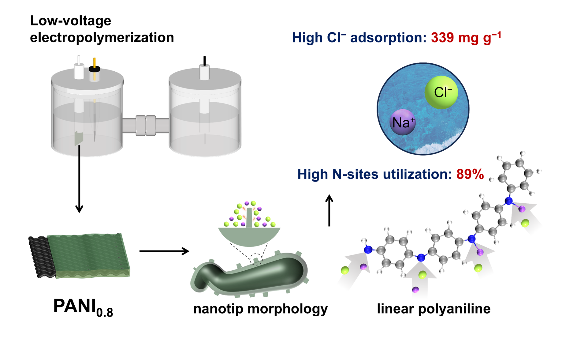 在鹵水資源電化學(xué)提取過(guò)程中,需兼顧電中性原則,因此高效提取伴生陰離子同樣重要。聚苯胺(PANI)憑借優(yōu)異的導(dǎo)電性和可逆摻雜特性,廣泛應(yīng)用于能源存儲(chǔ)、環(huán)境凈化和離子分離等領(lǐng)域。然而,傳統(tǒng)PANI因氮活性位點(diǎn)利用率低、微宏觀構(gòu)效關(guān)系不明確等問(wèn)題,限制了其在高性能電化學(xué)脫鹽中的應(yīng)用。研究團(tuán)隊(duì)創(chuàng)造性發(fā)現(xiàn)聚合電位是調(diào)控其微觀結(jié)構(gòu)(如聚合度、鏈結(jié)構(gòu)、缺陷類型)的關(guān)鍵參數(shù)。通過(guò)原位電化學(xué)光譜等手段論證,采用“低電位”策略可有效抑制偶聯(lián)副反應(yīng),制備出含納米尖端的低聚度線性結(jié)構(gòu)聚苯胺。該獨(dú)特結(jié)構(gòu)顯著提升了含氮位點(diǎn)的暴露效率和可接近性:實(shí)現(xiàn)突破性高容量氯離子吸附(Cl容量達(dá)339 mg/g)和鈉離子吸附(142 mg/g)。該工作顯著推動(dòng)了結(jié)構(gòu)可控聚合物的設(shè)計(jì)及其在電化學(xué)分離中的應(yīng)用。