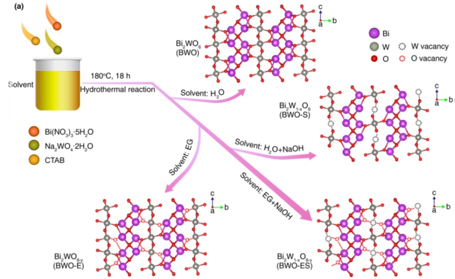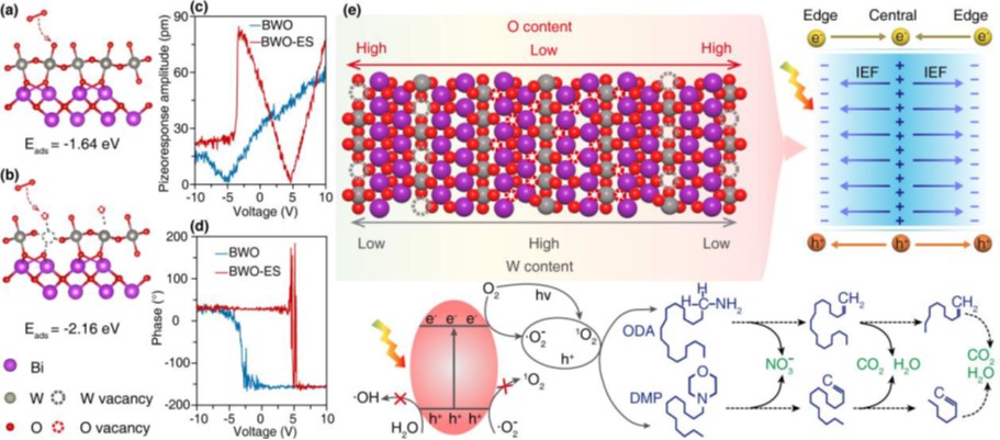 中國科學院青海鹽湖研究所輕合金與稀散元素分離課題組根據(jù)鉀鹽浮選藥劑性質(zhì)特點,聚焦綠色高效處理的研究需要,結(jié)合高原地區(qū)自然光輻照強度大等優(yōu)勢,優(yōu)化光催化材料缺陷工程改性策略,成功制備金屬/非金屬雙缺陷鉍酸鹽光催化材料,考察其對可見光的吸收利用,并對雙缺陷結(jié)構(gòu)改性鉍酸鹽光催化劑的催化作用機制開展深入剖析。研究發(fā)現(xiàn),在水熱制備Bi2WO6過程中加入適當比例的還原劑(EG)和刻蝕劑(NaOH),可以實現(xiàn)“一鍋法”在Bi2WO6納米片的中心和邊緣區(qū)域分別構(gòu)筑O缺陷和W缺陷,強化提升鉍酸鹽的催化性能。機理研究發(fā)現(xiàn):在雙缺陷結(jié)構(gòu)材料(BWO-ES)中,W缺陷作為負電荷中心,O缺陷充當局部的正電荷中心。當這些帶相反電荷的缺陷在晶格不同位置建立時,使Bi2WO6材料的靜電偶極距由本體材料(BWO)的1.54 D提升至BWO-ES的48.15 D,促使材料的內(nèi)建電場強度提升2.74倍,為光生電子-空穴對的有效分離提供了內(nèi)部驅(qū)動力,從而抑制光生載流子的復合,表現(xiàn)的瞬態(tài)熒光壽命由BWO的1.61 ns提升至BWO-ES的2.63 ns。此外,O缺陷的構(gòu)筑降低了材料的帶隙(2.78 ev→2.54 eV),拓展了材料的光響應范圍(446 nm→488 nm)。在可見光(λ≥400 nm)照射下,BWO-ES對十八胺(ODA)和十二烷基嗎啉(DMP)的降解速率分別達到13.31 mg/L·h和14.40 mg/L·h,是本體BWO材料降解速率的3.64倍和3.59倍,可實現(xiàn)鹽溶液中ODA、DMP的完全礦化。