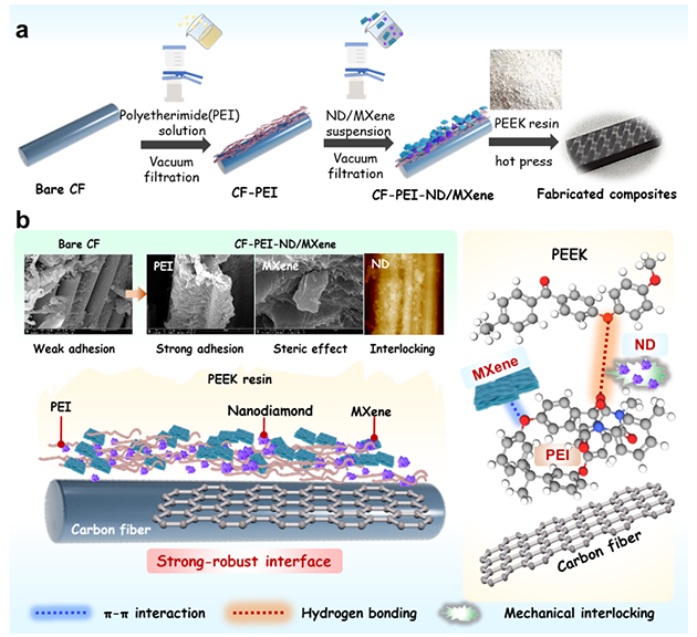 針對(duì)深海特異性損傷機(jī)理,課題組創(chuàng)新性地提出了一種強(qiáng)韌化界面增強(qiáng)策略。研究人員采用真空輔助壓力滲透技術(shù),在碳纖維織物表面成功構(gòu)筑了一種“剛-柔”并濟(jì)的雜化強(qiáng)韌界面結(jié)構(gòu)(圖2)。以聚醚酰亞胺為柔性相,發(fā)揮柔性粘接與應(yīng)力緩沖作用;以納米金剛石和二維MXene為剛性相提供物理阻隔與機(jī)械互鎖點(diǎn),協(xié)同抑制海水滲透擴(kuò)散、促進(jìn)應(yīng)力高效傳遞(圖4,5)。