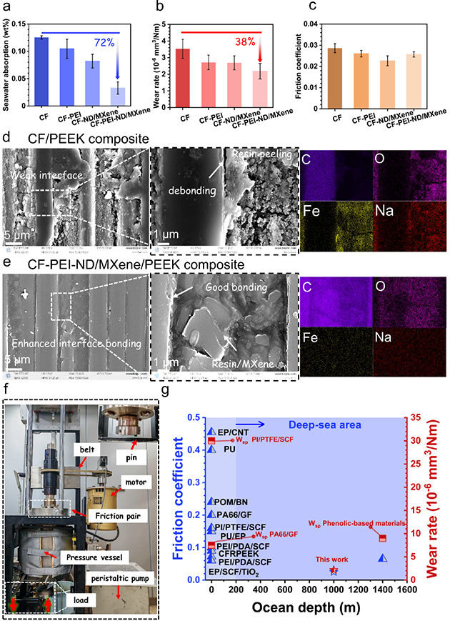 模擬深海高壓環(huán)境的原位摩擦磨損測(cè)試結(jié)果表明,這種有機(jī)/無機(jī)協(xié)同的界面設(shè)計(jì),能顯著提升復(fù)合材料在極端環(huán)境下的耐磨損性能(圖3)。在模擬1000米深海壓力下,制備復(fù)合材料的摩擦系數(shù)與磨損率均為目前文獻(xiàn)報(bào)道的同類材料最低值,為解決深海運(yùn)動(dòng)部件材料損傷防護(hù)與應(yīng)用提供了新思路。