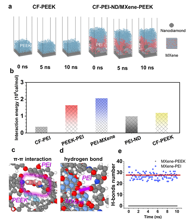 圖4.CF-PEEK改性復(fù)合材料界面結(jié)構(gòu)的分子模擬結(jié)果。(a)CF/PEEK復(fù)合材料和CF-PEI-ND/MXene/PEEK復(fù)合材料的模擬模型,(b)PEI與PEEK之間的π-π相互作用能和(c)PEI與PEEK之間的π-π相互作用,以及(d)PEI-MXene之間的氫鍵作用
