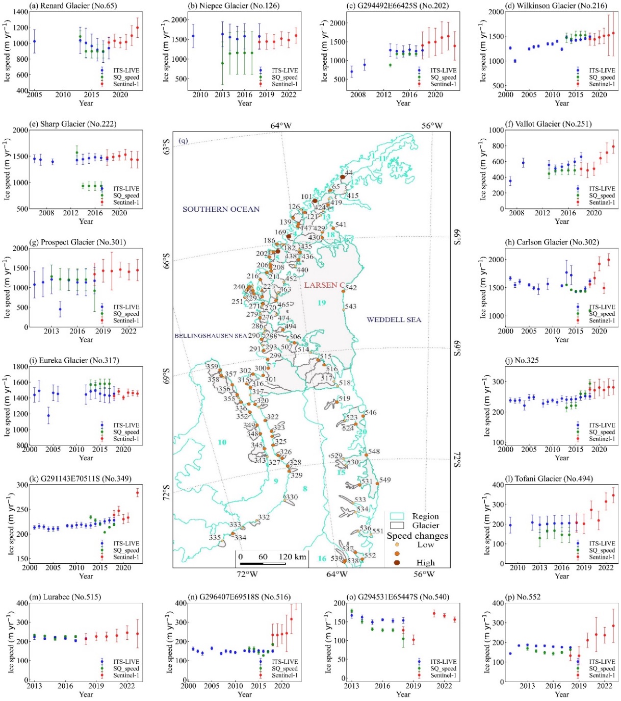 中國(guó)科學(xué)院西北生態(tài)環(huán)境資源研究院冰凍圈科學(xué)與凍土工程全國(guó)重點(diǎn)實(shí)驗(yàn)室康世昌研究員團(tuán)隊(duì),通過(guò)2018–2023年Sentinel-1 SAR影像反演獲得6181組有效冰川流速數(shù)據(jù),系統(tǒng)揭示了南極半島冰川流速的時(shí)空變化特征及空間差異規(guī)律。