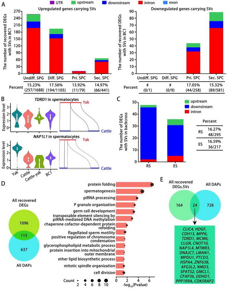 論文代表圖2:普通牛、牦牛、犏牛及BC1各類生殖細(xì)胞亞型中攜帶基因組結(jié)構(gòu)變異的差異表達(dá)基因。A) 柱狀圖顯示在犏牛精原細(xì)胞和精母細(xì)胞各亞群中,具有結(jié)構(gòu)變異且表達(dá)上調(diào)或下調(diào)、但在BC1中表達(dá)得以恢復(fù)的基因數(shù)量。B) 代表性基因的小提琴圖及其結(jié)構(gòu)變異的示意圖。C) 柱狀圖顯示與牦牛和普通牛相比,在BC1各類精子細(xì)胞亞型中攜帶基因組結(jié)構(gòu)變異的差異表達(dá)基因數(shù)量。D) 對(duì)BC1精母細(xì)胞中所有表達(dá)水平恢復(fù)的差異表達(dá)基因,與犏牛精母細(xì)胞中的差異豐度蛋白進(jìn)行韋恩圖分析及GO富集分析。E) BC1精母細(xì)胞中所有表達(dá)恢復(fù)的差異表達(dá)基因、具有結(jié)構(gòu)變異的差異表達(dá)基因,以及犏牛精母細(xì)胞中所有差異豐度蛋白的韋恩圖分析。