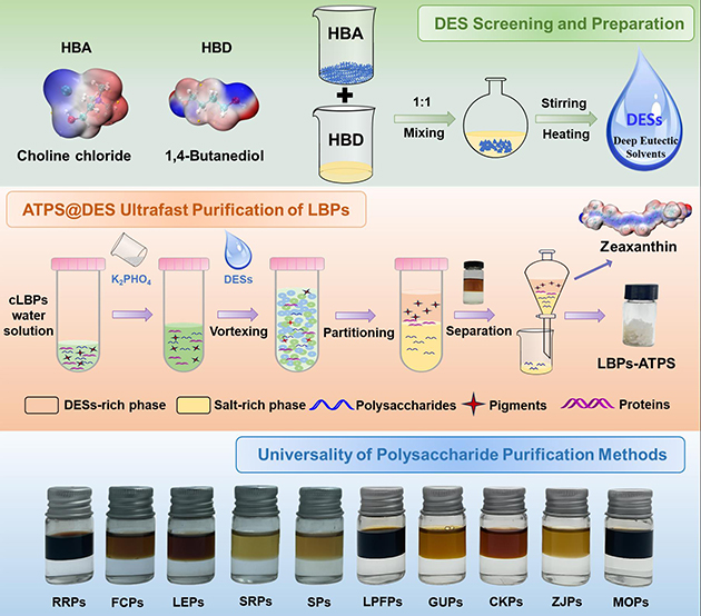 高效、精準(zhǔn)的分離純化是開展多糖精細結(jié)構(gòu)解析和活性研究的重大難題,而樣品前處理是多糖分離純化的重要基礎(chǔ)和前提。傳統(tǒng)多糖分離純化的樣品前處理技術(shù)包括脫脂、脫蛋白和脫色等過程,不僅操作繁雜、時間冗長,而且會導(dǎo)致多糖流失、結(jié)構(gòu)變化和活性失活等。針對上述問題,課題組提出了將低共熔溶劑(Deep Eutectic Solvents,DES)引入雙水相體系(Aqueous Two-Phase System,ATPS)的新思路,構(gòu)建了新型ATPS@DES多糖樣品前處理新體系,實現(xiàn)了枸杞多糖同步脫脂、脫蛋白和脫色;同時,在此溫和、綠色的條件下,實現(xiàn)了枸杞多糖高保留率和最大程度保持多糖的原始結(jié)構(gòu)特征。