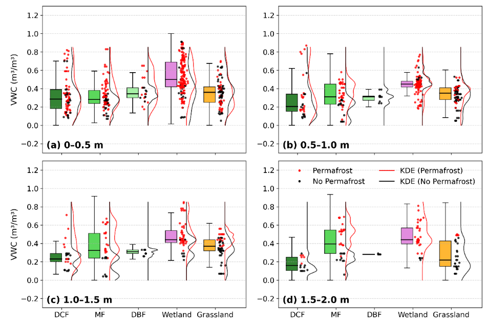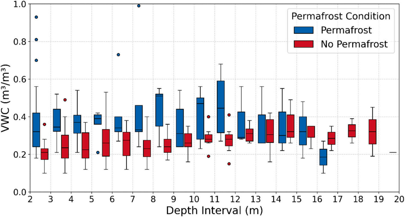 研究團隊在根河流域布設(shè)75個淺層土壤剖面和15個深達20米的鉆孔,獲取了覆蓋森林、草地、濕地等不同下墊面的土壤含水量觀測數(shù)據(jù)。并結(jié)合可解釋機器學(xué)習(xí)與結(jié)構(gòu)方程模型,系統(tǒng)揭示了邊緣多年凍土區(qū)土壤水分的“垂向分層”特征及其控制機制。