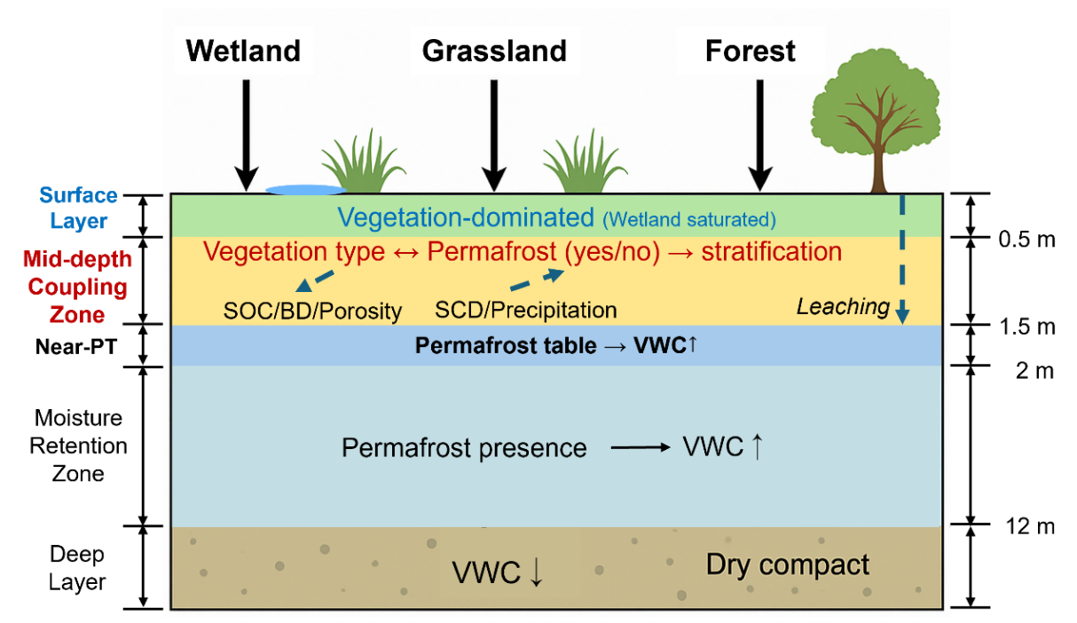 研究結(jié)果顯示,濕地覆蓋、土壤有機碳等地表與土壤屬性主導(dǎo)了淺層水分分布,土壤容重和多年凍土分布控制了深層蓄水與水分維持。氣候因子則主要通過改變地表溫度條件與凍融過程,間接影響水分結(jié)構(gòu)與分層格局。