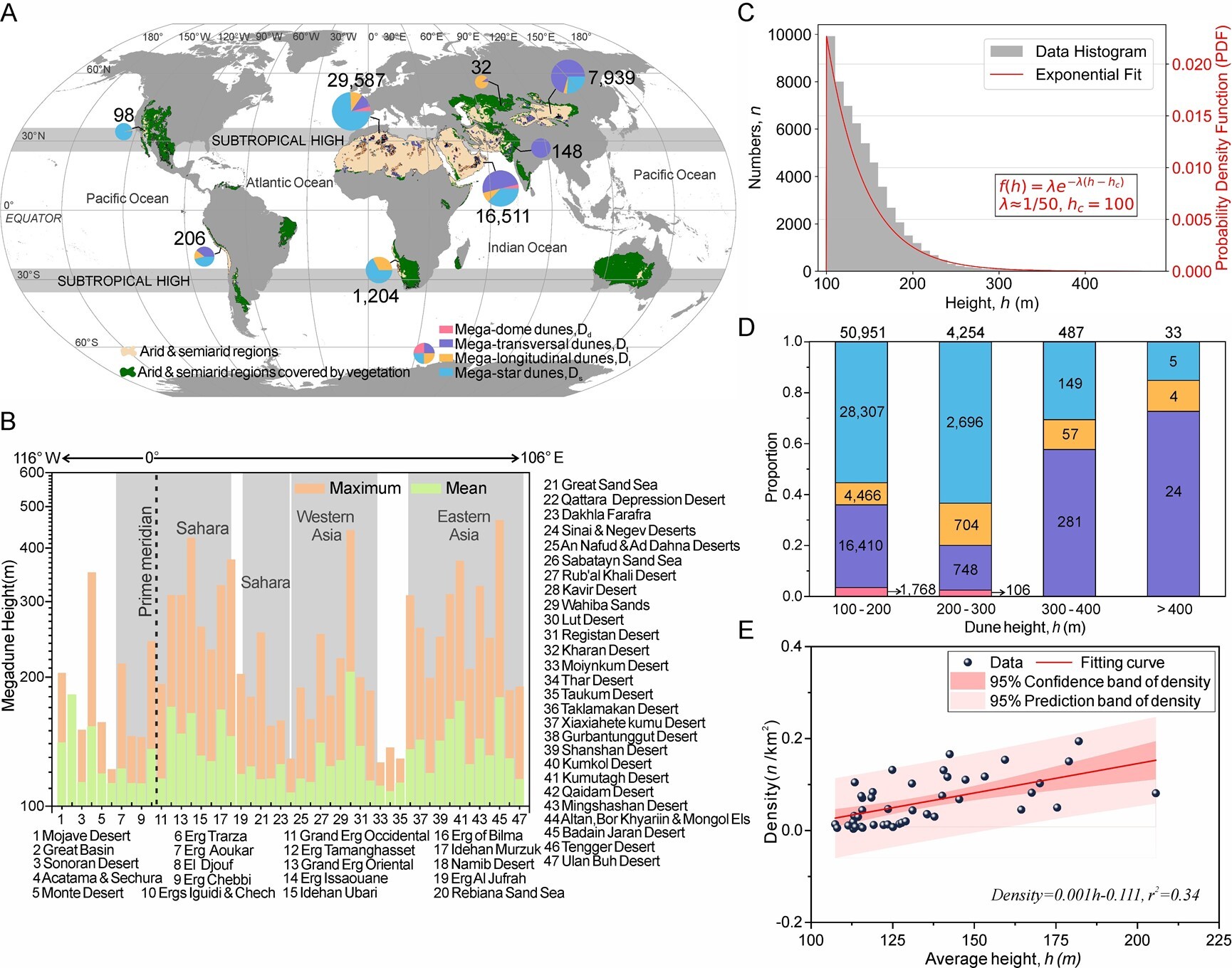 研究發(fā)現(xiàn),全球97%以上高大沙山集中于撒哈拉沙漠與亞洲干旱區(qū),充足沙源與強(qiáng)勁風(fēng)力是沙山發(fā)育的基礎(chǔ)條件;澳大利亞沙漠因植被覆蓋度高、輸沙量有限,而未發(fā)育沙山。全球近91%的沙山高度介于100–200米,且以星狀沙山為主,表明多向風(fēng)況更利于沙山的形成;高度超300米后以橫向沙山為主,超過(guò)400米的沙山僅有33座??臻g上,大陸內(nèi)部沙丘場(chǎng)沙山平均高度更高且沙山密度隨沙山平均高度升高而顯著增加。