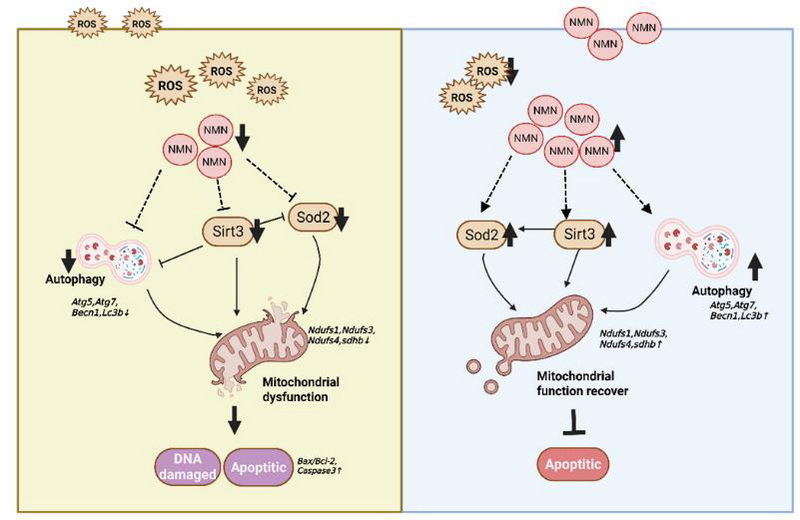 文章模式圖:胚胎期低氧通過 Sirt3/sod2 通路導(dǎo)致卵母細(xì)胞氧化應(yīng)激損傷,而煙酰胺單核苷酸添加可以部分恢復(fù)卵母細(xì)胞及卵巢功能