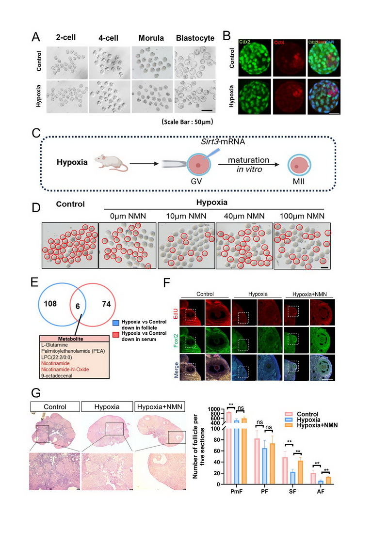 文章代表圖:(A)對照組與低氧組 2-細(xì)胞、4 -細(xì)胞、桑椹胚及囊胚期小鼠胚胎代表圖片(標(biāo)尺:50 μm)。(B)對照組與低氧組囊胚中滋養(yǎng)層細(xì)胞標(biāo)記物 Cdx2(綠色)、內(nèi)細(xì)胞團(tuán)標(biāo)記物 Oct4(紅色)及核標(biāo)記 DAPI(藍(lán)色)的免疫熒光共定位結(jié)果。(3)Sirt3 mRNA顯微注射低氧GV 期卵母細(xì)胞,進(jìn)行Sirt3過表達(dá)實(shí)驗。 (D) 對照組及低氧組卵母細(xì)胞在不同濃度 NMN 體外處理后的成熟情況對比(紅色圈標(biāo)記成熟卵母細(xì)胞,標(biāo)尺:50 μm)。(E)低氧組與對照組卵泡液及血清中差異代謝物的交集分析,下方列出 6 個核心重疊差異代謝物。(F)對照組、低氧組及低氧 + NMN 組卵巢組織中增殖標(biāo)記物 EdU(紅色)、顆粒細(xì)胞分化標(biāo)記物 Foxl2(綠色)及 Merge 圖的免疫熒光結(jié)果(白色虛線框為局部放大區(qū)域,標(biāo)尺:200 μm)。(G) 卵巢組織形態(tài)學(xué)分析與卵泡計數(shù):對照組、低氧組及低氧 + NMN 組卵巢組織 H&E 染色結(jié)果(左圖,標(biāo)尺為400 μm);各組原始卵泡(PmF)、初級卵泡(PF)、次級卵泡(SF)及有腔卵泡(AF)在 5 張連續(xù)切片中的數(shù)量統(tǒng)計(右圖)。
