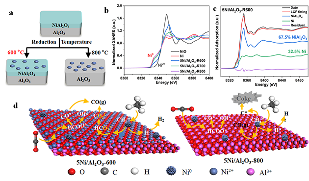 圖1.(a) Ni0/NiAl2O4/Al2O3制備示意圖; (b) 各還原溫度下的催化劑歸一化Ni K-edge XANES光譜;(c) 5Ni/Al2O3-R600的線性組合擬合(LCF)結(jié)果;(d)催化劑5Ni/Al2O3-600和5Ni/Al2O3-800的DRM反應(yīng)機(jī)理示意圖