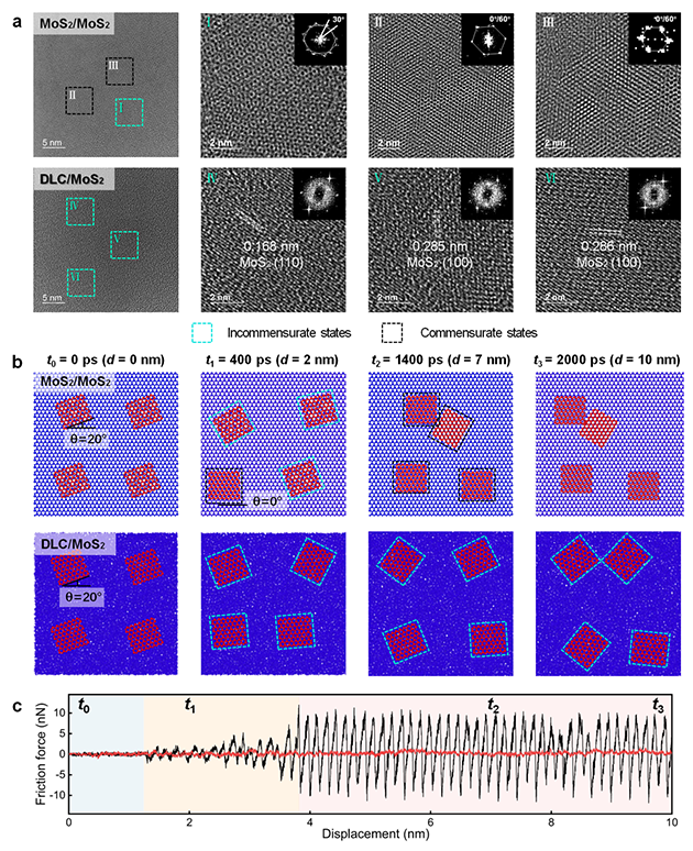 超潤滑工程尺度實現(xiàn)面臨三大核心挑戰(zhàn),即大尺度接觸面的隨機無序性導致超潤滑失控、高接觸壓力下界面形變導致超潤滑失效、大氣環(huán)境活性氣氛引發(fā)界面摩擦化學反應導致超潤滑失穩(wěn)。針對上述挑戰(zhàn),研究團隊從“宏觀接觸-微納界面-分子構型-原子晶格”跨尺度結構進行逐級設計。首先,基于歸一化接觸思想,通過激光織構構建規(guī)則的接觸陣列,將宏觀面接觸歸一化為無數等同的微米級單元接觸,使每個單元的接觸狀態(tài)(面積、形狀、 受力等)保持一致,這樣界面潤滑材料在同一接觸狀態(tài)下結構變化也趨于一致,整體變得可控(圖1);其次,在每個接觸單元表面構筑剛性非晶類金剛石碳(DLC)膜層/柔性晶體MoS2配副滑移元界面,剛柔結合有力削弱接觸界面在極端高接觸壓力下的形變;進一步采用MXene作為增強與錨定劑,使晶體MoS2在極端高接觸壓力和大氣環(huán)境下保持完整的層狀結構,減少了缺陷與邊緣的不利影響,賦予其抵抗水分子和氧氣氧化能力,從而維持超潤滑界面的穩(wěn)定。最后,揭示了運動過程中原子晶格匹配的動態(tài)偏轉微觀機制(圖2),即非公度態(tài)向公度態(tài)轉化,發(fā)現(xiàn)了非晶DLC/晶體MoS2永久非公度接觸特性,從根本上消除了晶格匹配所導致的原子互鎖。