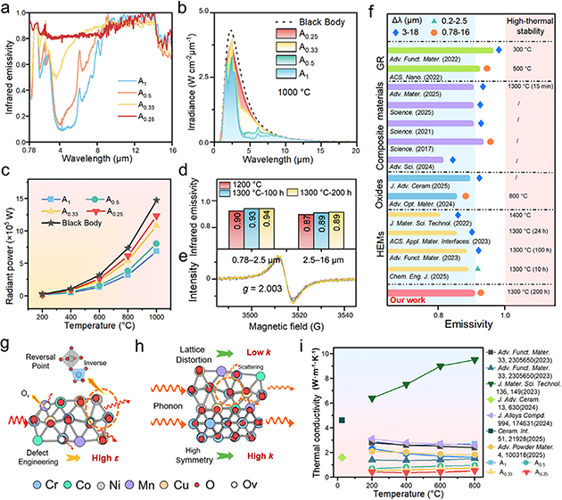 近期,該團(tuán)隊(duì)設(shè)計(jì)了一種將構(gòu)型熵與反尖晶石有序化耦合的通用化學(xué)策略,以實(shí)現(xiàn)穩(wěn)鍵的寬帶紅外發(fā)射率,在紅外輻射熱管理領(lǐng)域取得了新進(jìn)展。針對(duì)構(gòu)型熵與位點(diǎn)反轉(zhuǎn)、缺陷化學(xué)與晶格動(dòng)力學(xué)耦合如何調(diào)控紅外輻射性能這一科學(xué)問題,該團(tuán)隊(duì)通過簡(jiǎn)便、低成本的固相合成法,采用熵驅(qū)動(dòng)位點(diǎn)反轉(zhuǎn)設(shè)計(jì)合成了中熵氧化物(Co0.25Ni0.25Mn0.25Cu0.25)Cr2O4(如圖1),重點(diǎn)研究了中熵氧化物內(nèi)部混合價(jià)態(tài)、氧空位和電子結(jié)構(gòu),結(jié)果表明,熵驅(qū)動(dòng)位點(diǎn)反轉(zhuǎn)促進(jìn)了混合價(jià)態(tài)和豐富氧空位,增強(qiáng)了軌道雜化并激活了紅外聲子,將傳統(tǒng)尖晶石氧化物轉(zhuǎn)化為近黑體、耐高溫的紅外輻射體;該材料在0.78–16 μm波段的發(fā)射率達(dá)0.90,其中在1000 °C以上關(guān)鍵輻射換熱窗口(2–8 μm)的發(fā)射率是二元氧化物的兩倍以上(如圖2);材料在1300 °C下經(jīng)過200小時(shí)高溫老化后,仍保持單相結(jié)構(gòu)和高發(fā)射率;塊體材料表現(xiàn)出低熱導(dǎo)率(800 °C時(shí)為0.53 W·m-1·K-1),作為可噴涂涂層在鋼和耐火材料上實(shí)現(xiàn)約0.96的發(fā)射率,模擬顯示可使?fàn)t內(nèi)溫度提高約44.3 °C。