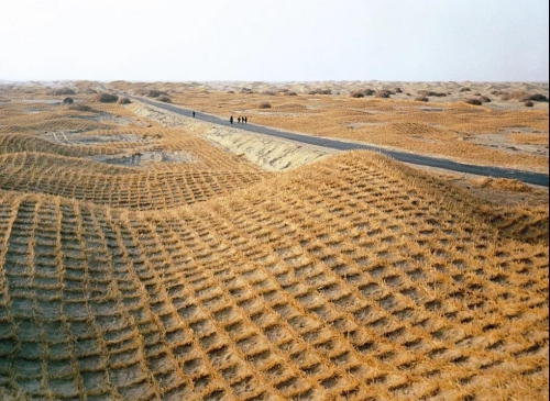 實(shí)際上,草方格最早應(yīng)用于我國第一條沙漠鐵路包蘭鐵路的建設(shè)中。在寧夏沙坡頭地區(qū)火車穿越了騰格里沙漠,在科技工作者和當(dāng)?shù)厝罕姷墓餐ο?,麥草方格編成的巨網(wǎng)最終成功縛住了“沙龍”。沙坡頭因此被稱為“草方格的故鄉(xiāng)”。如今,一把鐵鍬,一捆麥草,一片草方格,沙坡頭實(shí)現(xiàn)了黃沙變綠洲的嬗變,騰格里沙漠中神奇地出現(xiàn)了一條連綿延伸的“綠帶”。