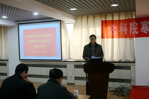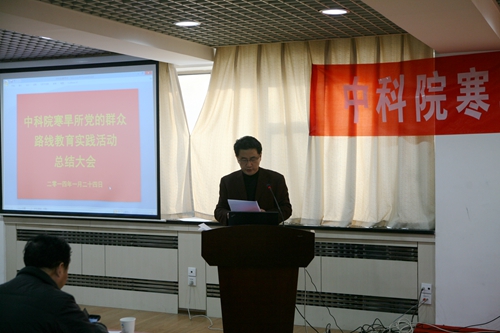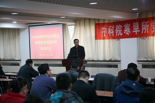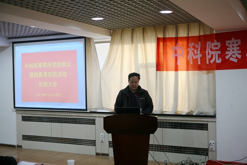 之后,寒旱所黨委書記、副所長呂世華作了寒旱所黨的群眾路線教育實踐活動總結(jié)報告。呂世華介紹了寒旱所群眾路線教育實踐活動基本情況、主要做法、取得成效。寒旱所教育實踐活動自2013年7月全面啟動以來,所黨委認真深入學習中央和中科院的精神,按照中央“照鏡子、正衣冠、洗洗澡、治治病”的黨的群眾路線教育實踐活動的總體要求,圍繞中央八項規(guī)定、院“12項要求”和反對“四風”精神,通過學習教育、聽取意見,查擺問題、開展批評,整改落實、建章立制環(huán)節(jié),結(jié)合研究所的工作實際, 扎實、有序、高質(zhì)量地推進了黨的群眾路線教育實踐活動。通過教育實踐活動,進一步堅定了理想信念、明確了創(chuàng)新責任,堅定了“創(chuàng)新為民”宗旨,進一步促進了作風轉(zhuǎn)變、提升服務能力,強化了“務實求真”作風,進一步加強了科研管理和廉潔從業(yè)風險防控體系建設,強化了制度建設,初步形成踐行黨的群眾路線的長效機制